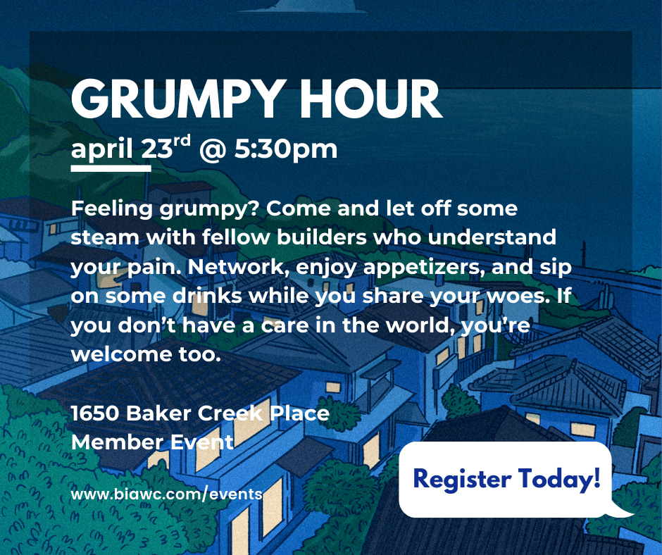 ** Canceled ** Feeling a bit grumpy? Need a place to vent, gripe, and complain? We've got just the event for you! Join us for Grumpy Hour – the perfect antidote to Happy Hour. Date: April 23rd Time: 5:30 PM - 7:30 PM Location: 1650 Baker Creek Place Come and let off some steam with fellow builders who understand your pain. Network, enjoy appetizers, and sip on some drinks while you share your woes. It's the one time where being grumpy is not only allowed but encouraged! Don't miss out on the fun – or should we say, the grumpiness! See you there!